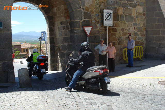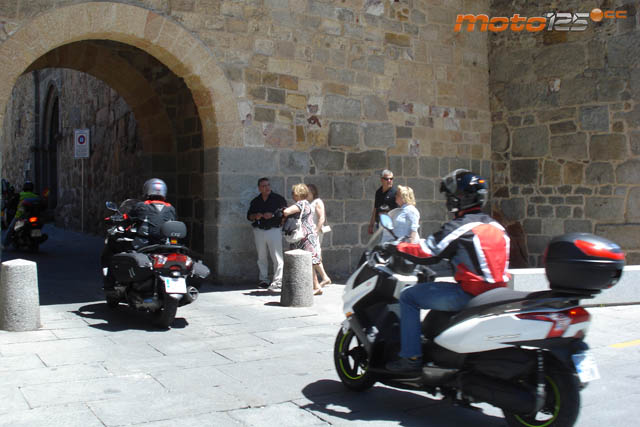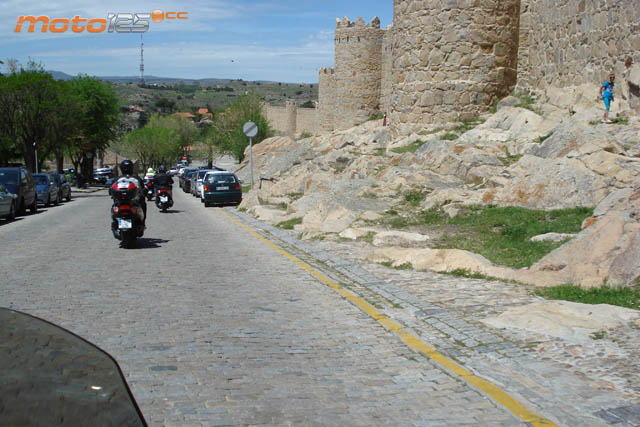 Parada antes de entrar a Ávila para recoger a los más rezagados (las 125 cc iban primeras) y entrada triunfal cruzando las murallas. La verdad es que estas visitas dejan al público sorprendido de ver a tanto scooter junto, e incluso hasta las motos turísticas y deportivas que nos cruzamos.