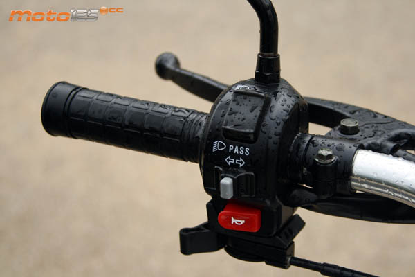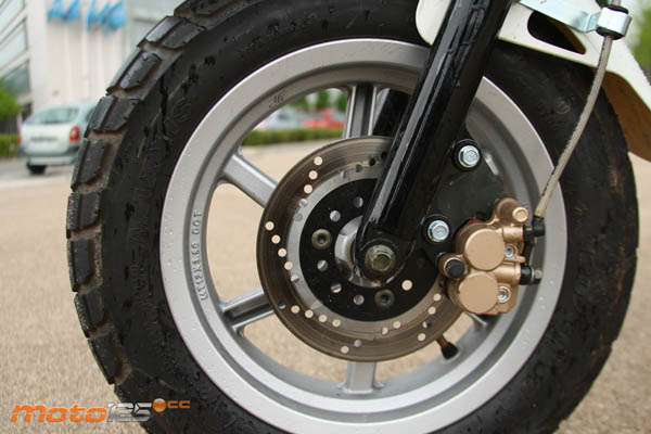 En el tren delantero encontramos un potente freno de disco y ruedas “gordas” de 12 pulgadas con dibujo mixto, para hacer alguna escapada off-road. | Los mandos tienen buen tacto. Se agradece que la palanca del estárter se encuentre en la piña izquierda, para no tener que meter la mano en la mecánica. | El freno trasero está confiado a un sencillo tambor. Dado el contenido peso del vehículo y sus prestaciones, no hace falta pedir más, aunque deberás mantenerlo bien tensado. |