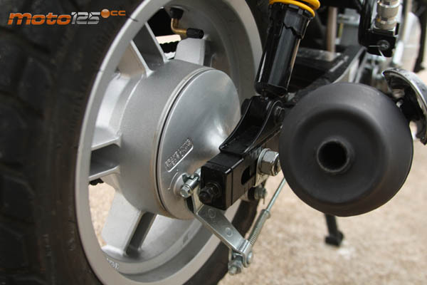 Pero es que, aunque parezca un juguete, la Hartford Mini es una cosa muy seria y, como tal, sus creadores han puesto mucho mimo en cuidar hasta el mínimo detalle. Y nos lo han demostrado en las suspensiones, montando una horquilla telescópica en el tren delantero que no “cruje” en situaciones límites (haciendo el bestia como en una pit-bike) y un par de amortiguadores con ajuste de precarga y muelle de paso variable (conforme se van comprimiendo, la suspensión se endurece consiguiendo un efecto progresivo).