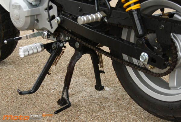 El Mini 125 no oculta su lado “simpático”, calzando ruedas de 12 pulgadas de balón “gordo” y dibujo mixto, con las que te permite alguna escapadita off-road, si te lo propones. Sentado se llega perfectamente al suelo con las dos plantas de los pies (faltaría más, con lo bajita que es), lo que aporta sensación de seguridad y control para los novatos de la convalidación. Con los pies en las estriberas, resulta bastante cómodo; no vas como en una pit-bike, encogido con miedo a que lo que llevas en los bolsillos de los pantalones se te vaya a caer. Recuerda más, en este sentido, a la posición de conducción de una YBR 125 de Yamaha, pero con una manejabilidad que se sale de lo normal. Eso sí, le pasa lo mismo que a la YBR: las estriberas van unidas al bastidor sin ningún tipo de bisagra que las pliegue, por lo que, en caso de caída, habrá que enderezarlas… como buenamente se pueda.