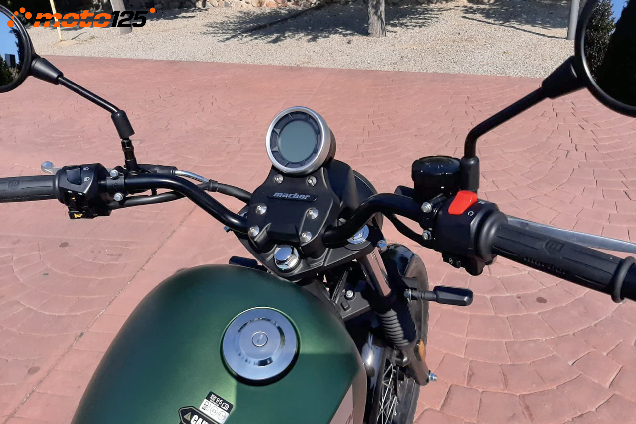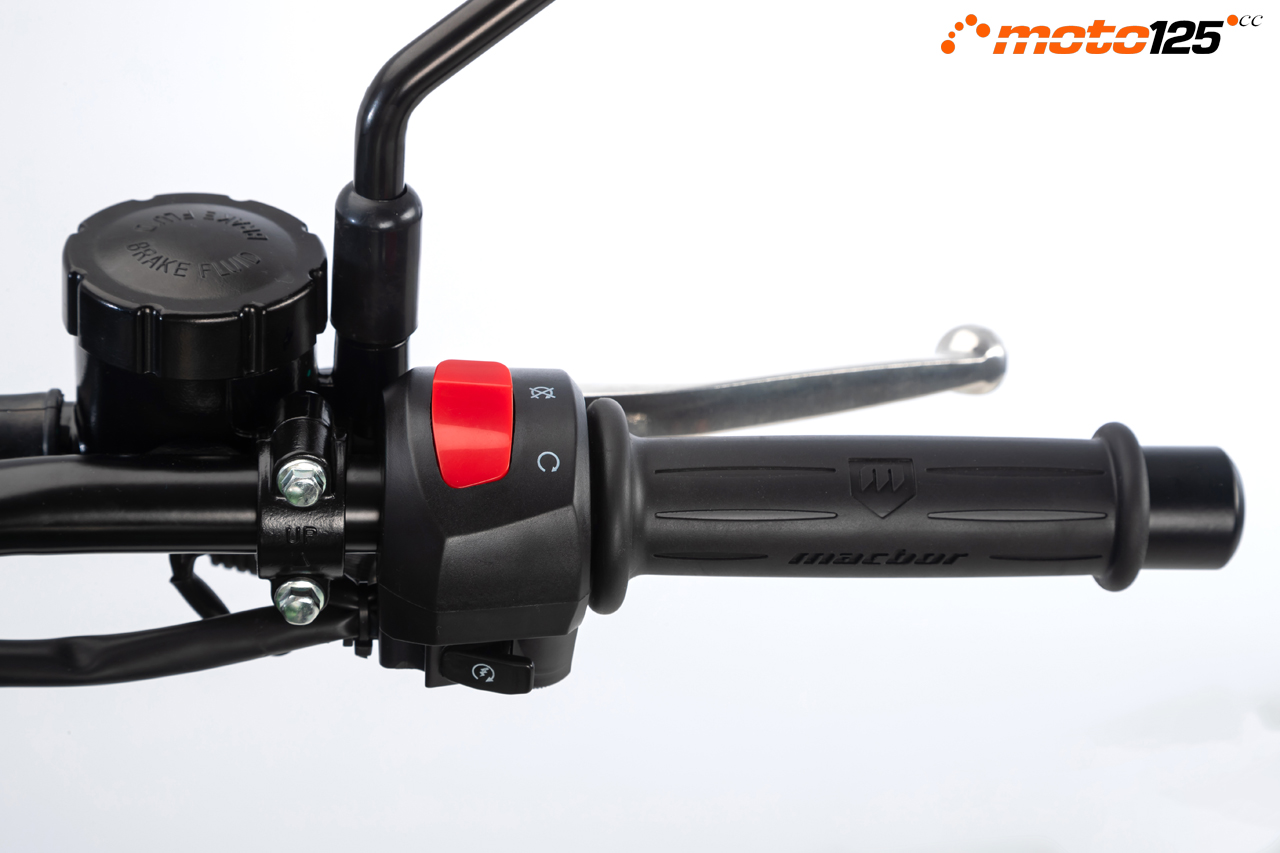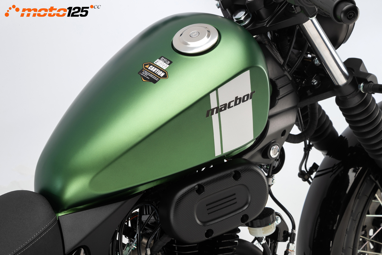 Pero sí que aportan modificaciones poco visibles pero muy apreciables. Sin lugar a dudas, el cambio más importante se encuentra en el motor. Recordemos que se recurría a un motor refrigerado por aire de inspiración Honda CB-F, y aunque por fuera parezca el mismo, lo cierto es que se ha cambiado casi por completo. El principal se encuentra en la culata que ahora recibe 4 válvulas en lugar de dos estrenando una tapa de balancines con un aleteado muy característico y que, sin duda, colaborará a la disipación de calor que ahora será más necesaria. Esto, junto con un aumento de la relación de compresión de 9,5 a 12, y unas medidas internas de carrera corta (53,3 x 48,4 mm en lugar de las 52,4 x 57,8 mm anteriores) permiten elevar la potencia máxima desde los 9,5 a 12,2 CV a 9.500 vueltas. Y se nota. Como también se nota el empuje que alcanza un máximo de 9,9 Nm (antes 9,0 Nm) a las 8.000 revoluciones. En Macbor nos aseguran que la caja de cambios estrena nuevas relaciones, manteniendo el eje de equilibrado para anular por completo sus vibraciones. De la inyección se ocupa ahora La marca FAI aportando un nuevo mapa de inyección para este motor que, casi con toda seguridad, es el mejor refrigerado por aire que conocemos del mercado de las 125 cc.