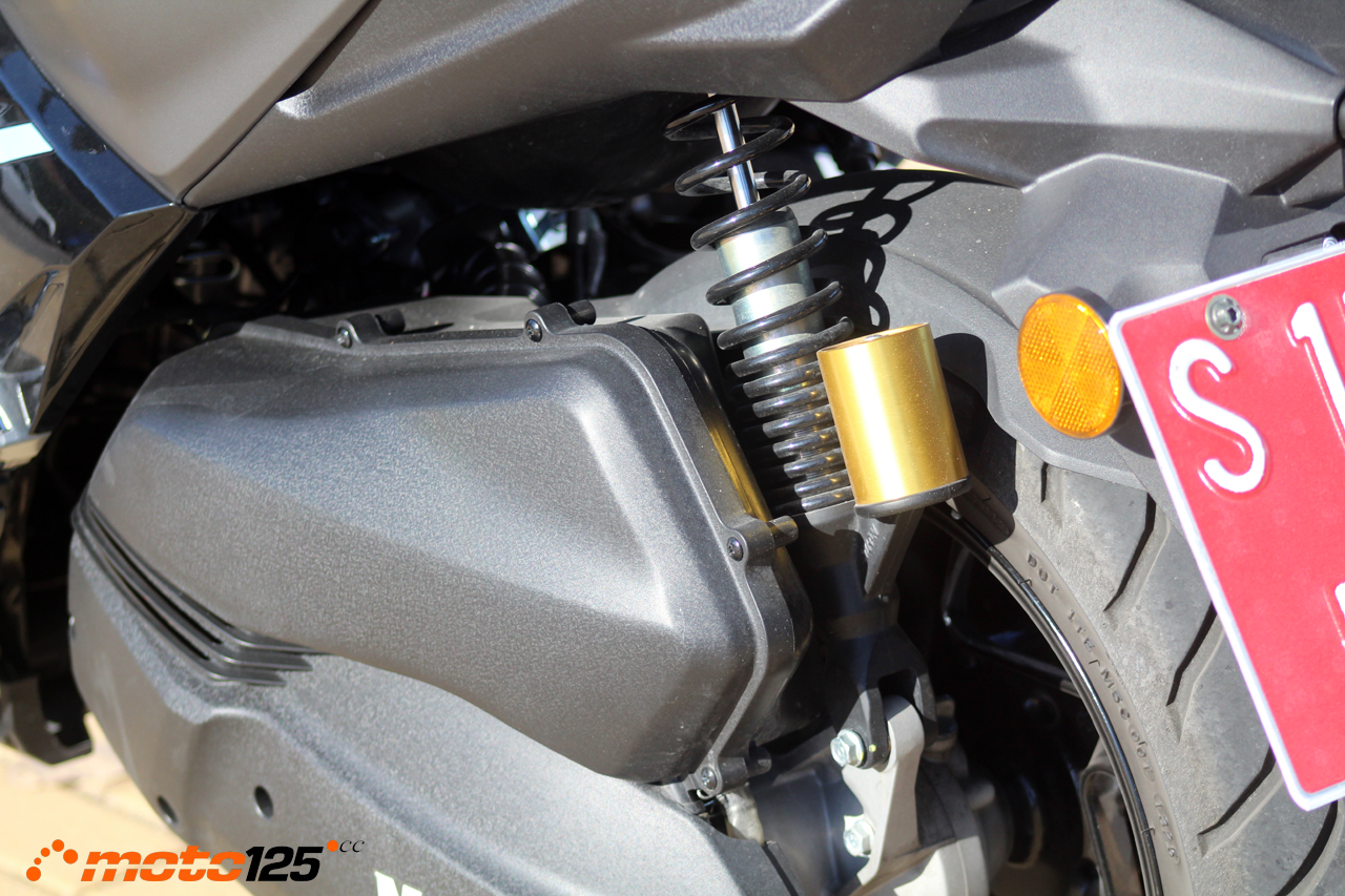 De la suspensión trasera se ocupan un par de amortiguadores con depósito adosado simulando funcionamiento oleoneumático con muelle de doble paso pero sin ajuste de precarga. El tren posterior se completa con llanta de 13 pulgadas y disco de 220 mm mordido por una pinza de simple pistón. Para este freno, la maneta izquierda cuenta con un bloqueo o freno de estacionamiento, además de disponer ambas manetas de ajuste ergonómico de apertura en cuatro posiciones. Ambos frenos cuentan con ABS independiente y control de tracción TCS desconectable.