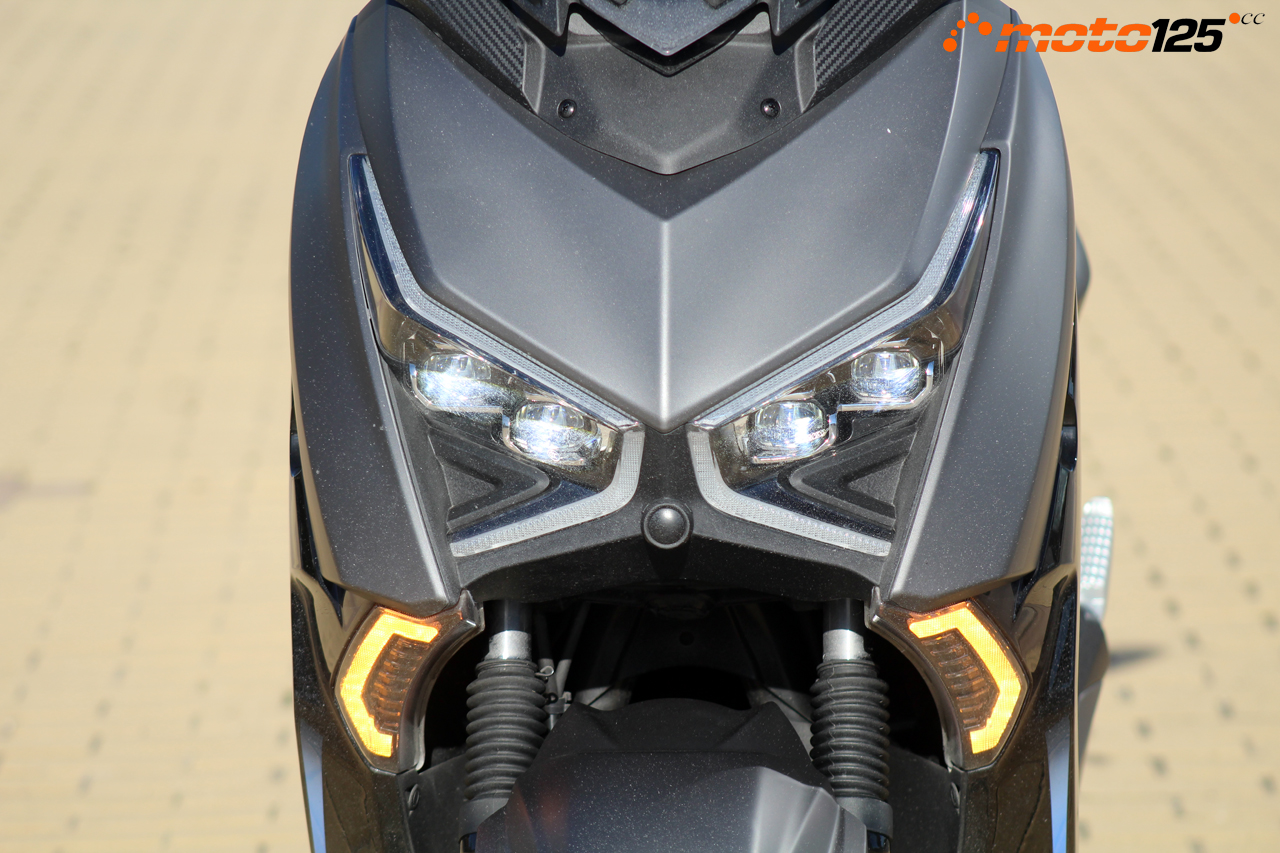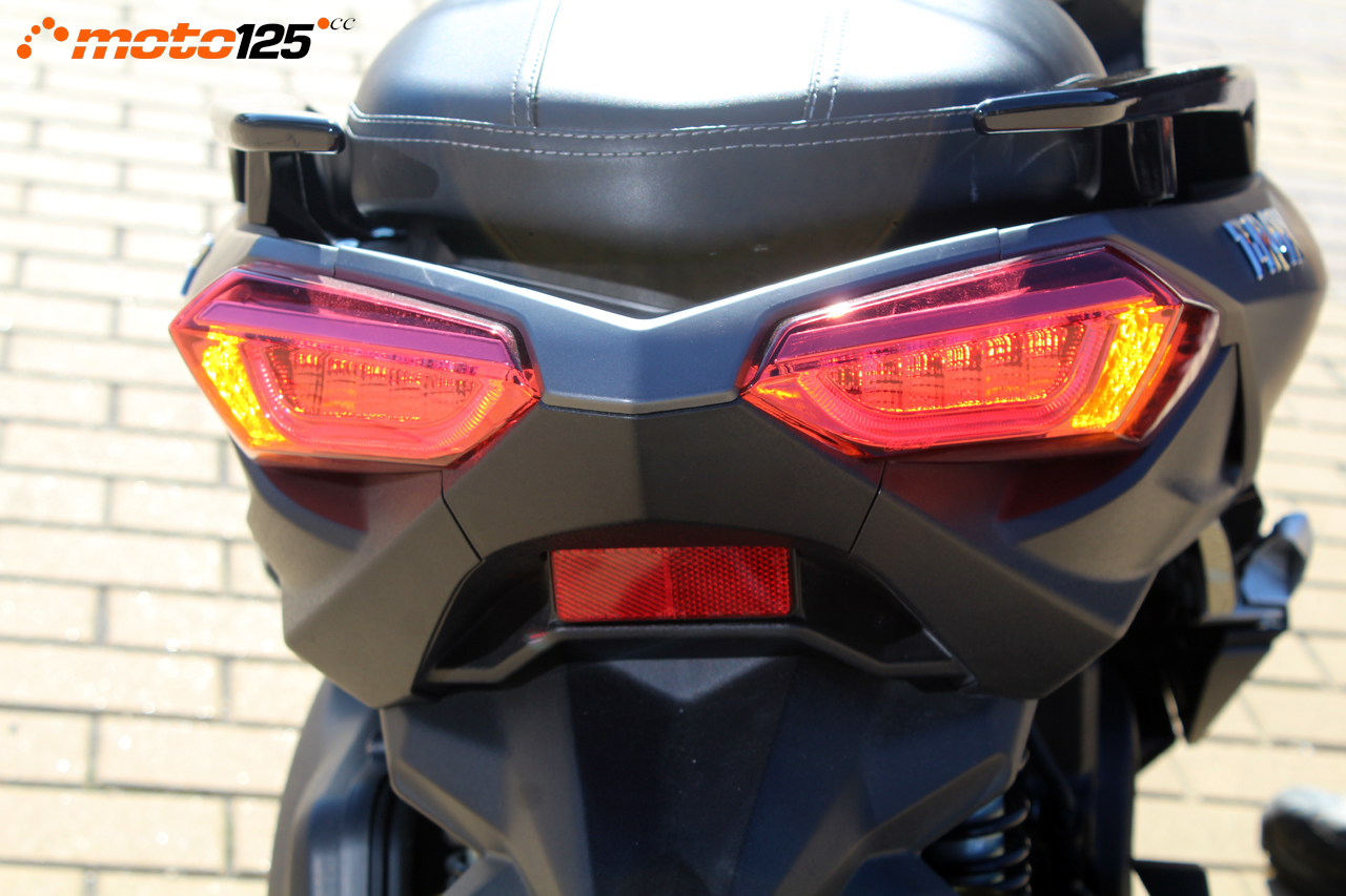 Detrás se desdobla el piloto trasero en dos con un diseño inspirado en el del Yamaha X-Max empleando una guía luminosa en “U” para la posición y una matriz de LEDs más intensa para la luz de freno. Los intermitentes traseros se integran en ese doble piloto en posición vertical por los lados exteriores.