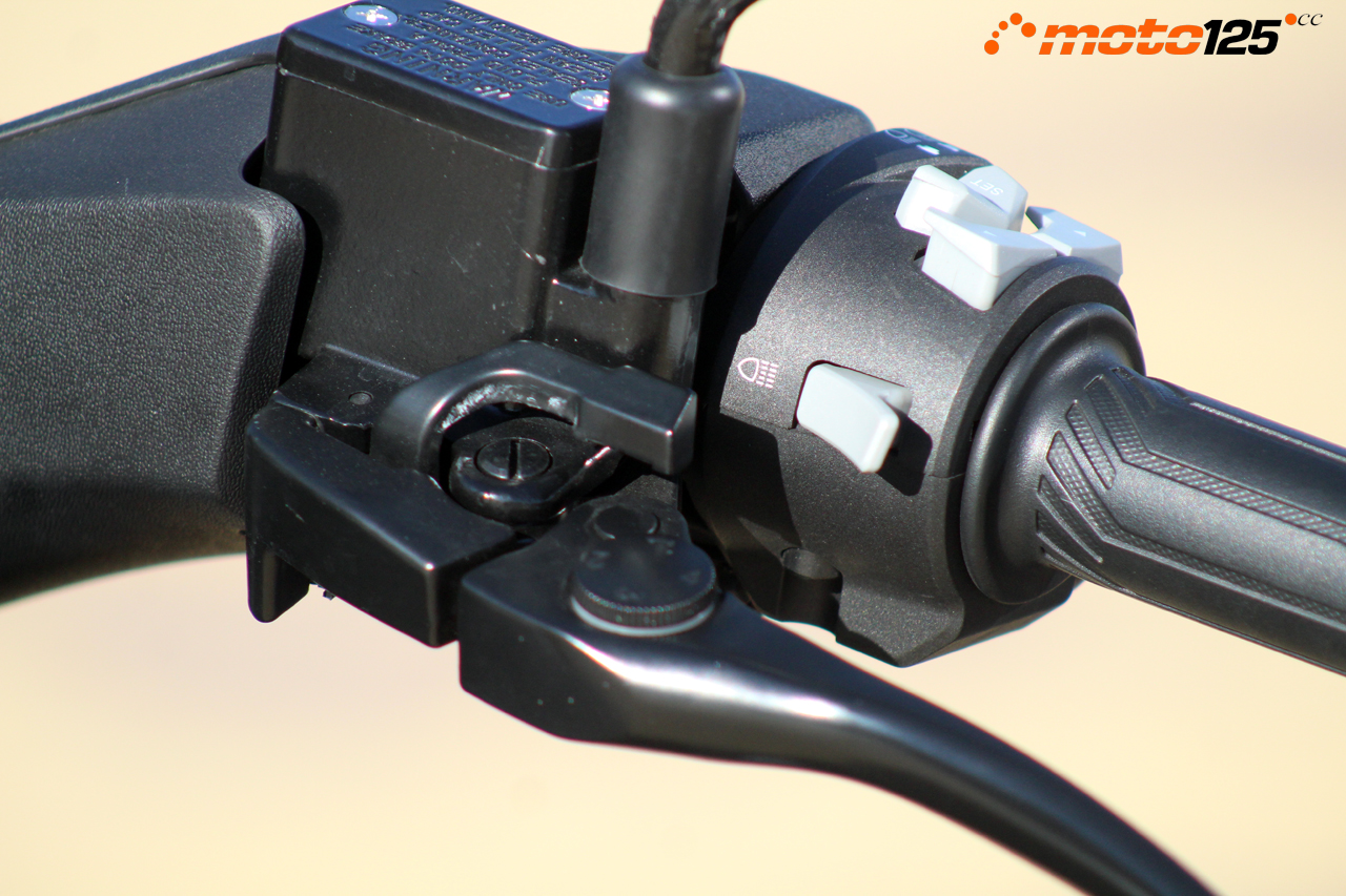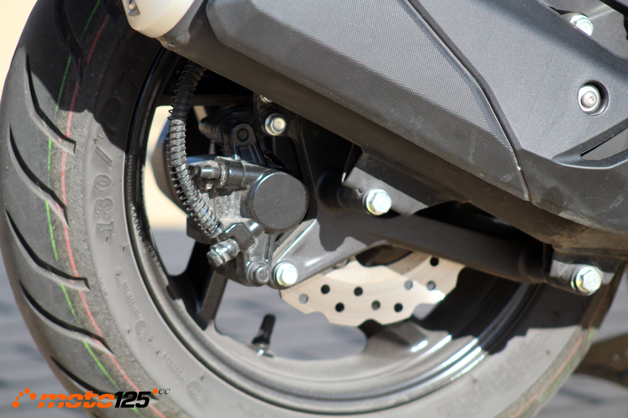 En lo que respecta a suspensiones nos ha llamado la atención su horquilla delantera de eje retrasado con barras protegidas por fuelles. Completa el tren delantero una llanta media de 14 pulgadas y un freno de disco de 240 mm mordido por una pinza de doble pistón con anclaje radial.