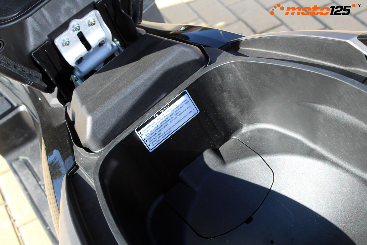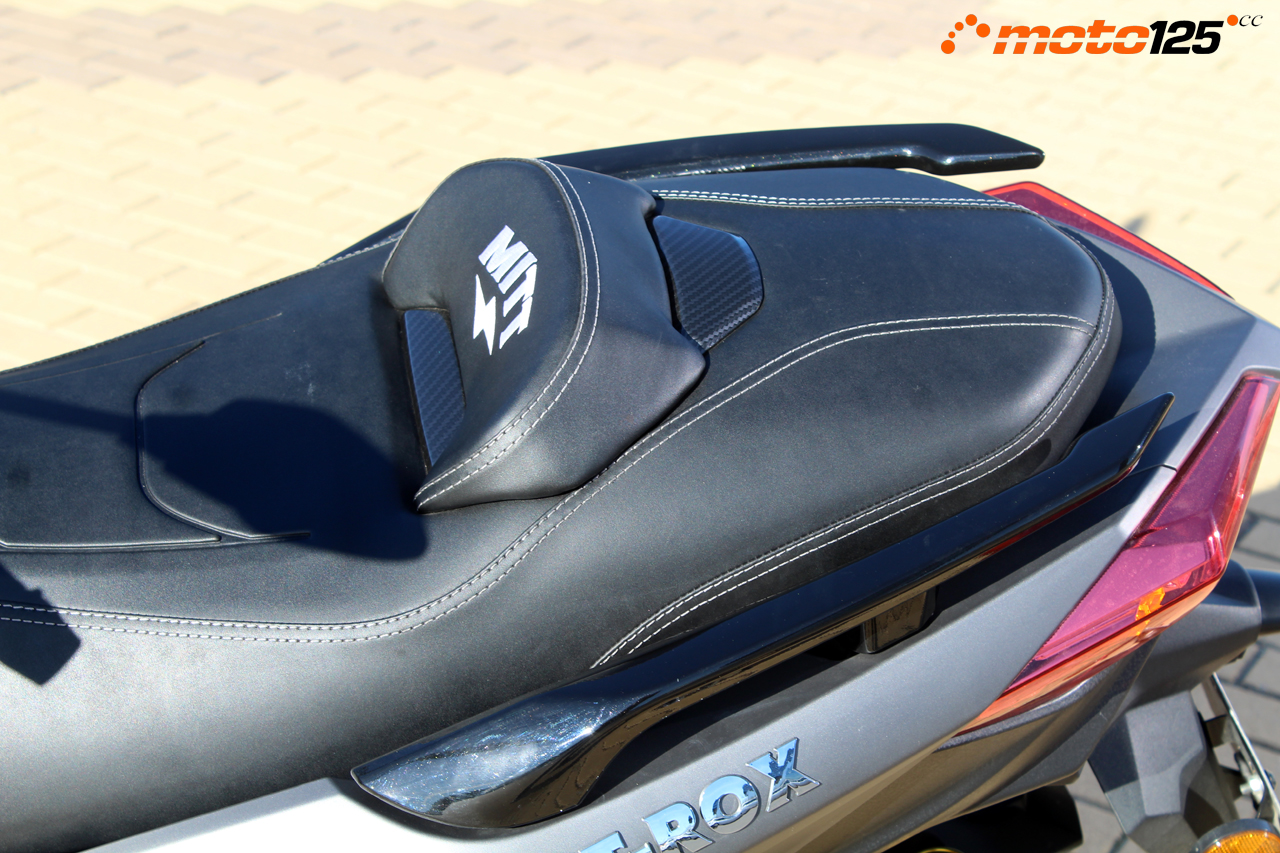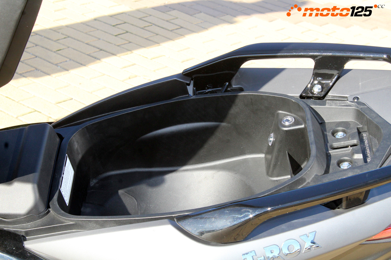 El asiento muestra un acabado Premium por la doble costura con relieves antideslizantes en su superficie y el envolvente respaldo que lleva bordado el nuevo logo de la marca. Debajo del asiento, el T-Rox sí que da cabida a un casco integral, introduciéndolo con la apertura del cuello hacia arriba, y disponiendo el compartimento de luz de cortesía además de un práctico bolsillo para llevar la documentación.